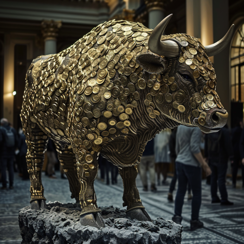 a bull statue made out of bitcoin coins, magica, cinematic --s 50 --v 6.0 --style raw