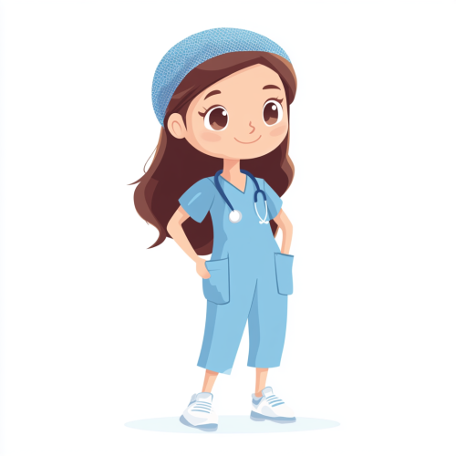 A girl with brown hair in blue scrubs, blue hairnet, white sneakers, flat design, simple illustration, vector art, minimalistic, white background, white color palette, flat colors, simple shapes, low details, 2d animation style, digital painting, drawing style, simple lines, flat color blocks, cartoonish character design, no shadows or textures, high contrast