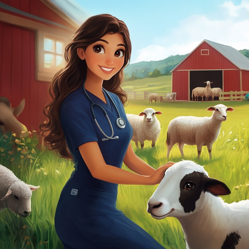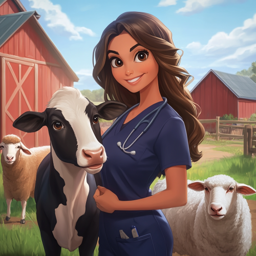 female character who has brown long hair and dark brown eyes in navy blue scrubs (she is a veterinarian) petting a cow for wellness with a goat and sheep in the background. Also, a red barn in the background.