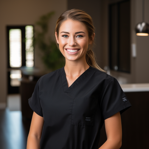 A photo of a white nurse face and shoulders taken in front, with no makeup on her slightly smiling mouth. The background is hospital setting. It's an iPhone selfie, taken at at desk. A closeup shot of a woman wearing scrubs with loose waves hairstyle.and a surgical mask on --ar 3:4