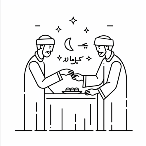Create a minimalist line art style image of A Eid card being exchanged between friends during EID holiday, using clean, unbroken lines on a white background. The design should feature a single continuous line that forms the subject without any additional shading or detail. Emphasize the simplicity and elegance of the form, with a modern and graphic quality that is typical for icons and digital illustrations. The subject should be centered in the image.