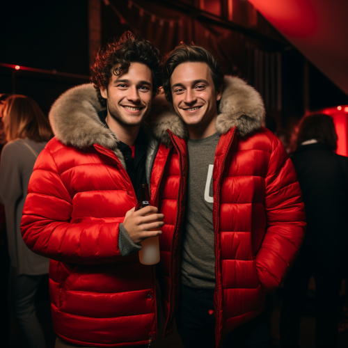 Two handsome young men at a Halloween party. One wearing a Netflix logo, the other wearing an oversized, warm winter coat