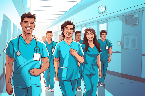 happy doctors, in hospital corridor, wearing scrubs, hospital, cheerful, happy, realistic, --ar 3:2