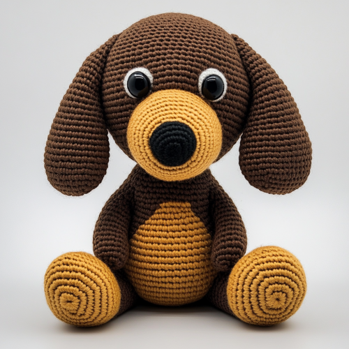Create an Amigurumi of a Dachshund dog named Pipoca, in a sitting position, with a cute and round body made of soft, fluffy yarn. The Amigurumi should have the same colors as the real dog: a smooth dark brown coat with lighter tan accents on the chest, paws, and face. Use big, round plastic eyes and a black plastic nose. The ears should be long and floppy, like in the reference image. The size of the Amigurumi is 25 cm in height. Plain white background.