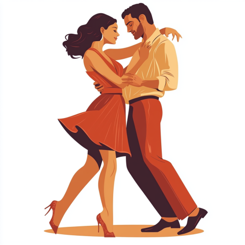 A pair of ballroom dancers are dancing a jive. A girl in a short dress and Latin shoes, a guy in wide pants. Vector style, without shadows, in warm colors.