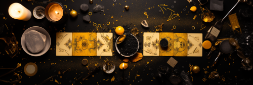 luxury fashion editorial photos of minimalist trendy 2024 yellow deck top view black cauldron , herbs and tarots cards, many black candle around and fairy dust, white background --ar 9:3