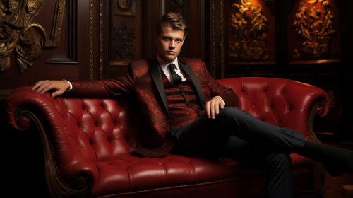 Confident, empathetic, stylish man, sat on a full length red leather chesterfield sofa, ::fashionable luxurious blazer and jeans, mid-thirties age, ::side on pose, ::full wrist showing, --no wristwatch, outdoor landscape, Hasselblad X2D-100c, f/2.8 aperture, cinematic lighting, global illumination --ar 16:9 --v 5.2