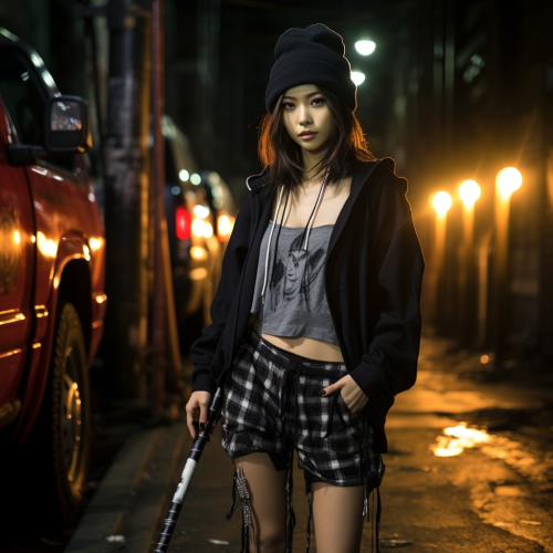 Beautiful asian women, mid twenties, wearing streetwear, backwards cap, oversized black hoody, black and white stripes plaid skirt, leggings, black boots with white laces, clothing has straps and chains, women is holding a black baseball bat with spikes, set in an alley way, at night, blacked out jeep on fire in background, full body image, music video, hyper realistic, 4k, UHD.
