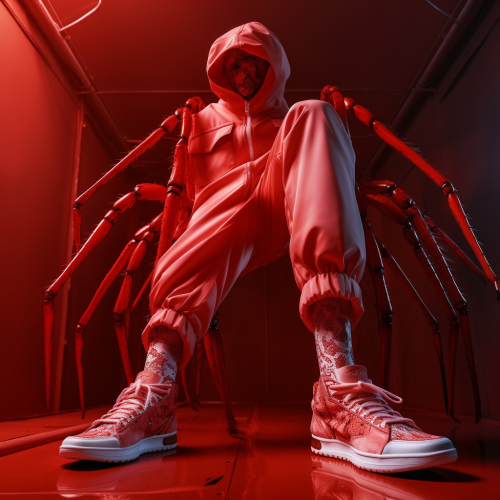 character sheet of 3D rendered vinyl very extreme exaggerated features attractive streetwear model Devil man wearing a massive very exaggerated giant oversized nylon blue puffer vest with clouds printed with fluffy spiral patches and star pins with very tight navaho pillow nylon pants with multiple zipper pockets over spirit bird patches and giant extremely oversized running sandals with beaded straps made of speckled dream lizard spirit shaman on a white background