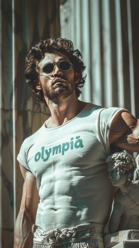 A 30 year old man with muscles, sunglasses, and a standing posture imitating the sculpture of David, with "olympia" words in green dynamic font on his black T-shirt,Instagram model, aesthetic, streetwear, fashion aesthetic photo, ultra quality, high details, 8k, masterpiece , v6 --ar 9:16