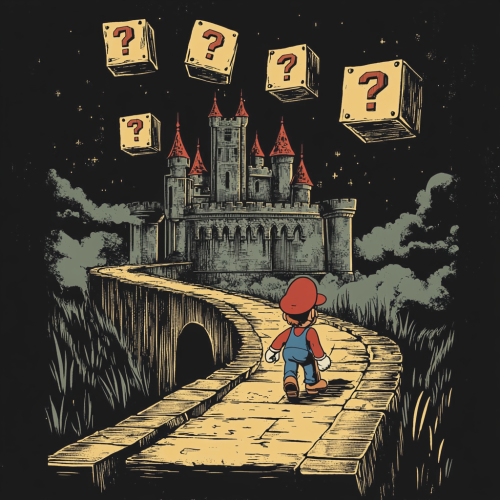 mario tshirt design graphic, 70s dark fantasy hand drawn style, D&D inspired design, with Mario walking to Bowser's castle in distance, question mark blocks floating in the air, black background, suitable for tshirt graphic