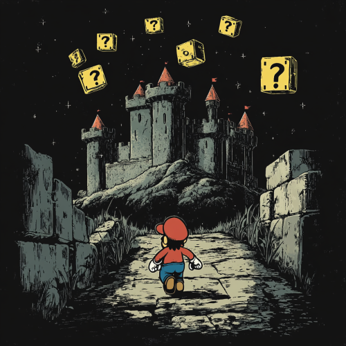 mario tshirt design graphic, 70s dark fantasy hand drawn style, with Mario walking to Bowser's castle in distance, question mark blocks floating in the air, black background, suitable for tshirt graphic, vintage colours