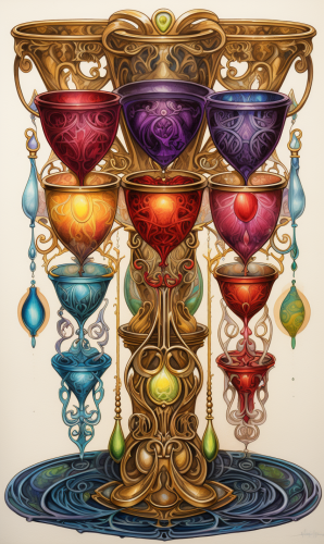 colored Pencil, very detailed, dinamic colors, Six of Cups from a Tarot Deck, fantasy elements --ar 897:1497