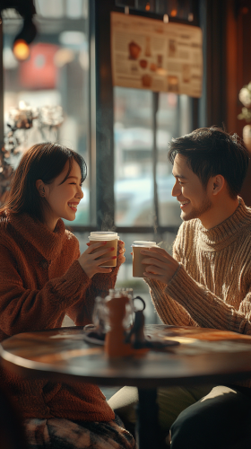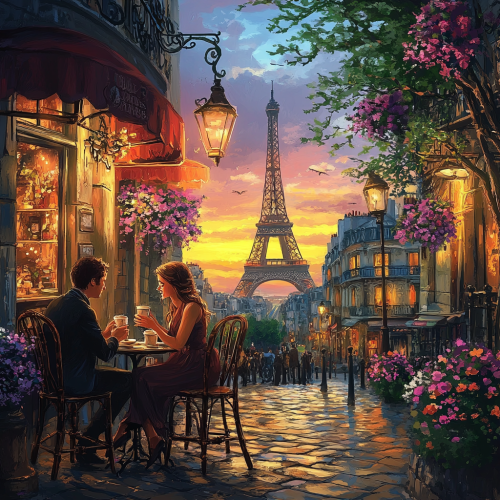 A couple sitting outside a cozy Parisian café, sipping coffee, surrounded by blooming flowers and vintage street lamps. They are sitting close, their faces filled with love and warmth, as the Eiffel Tower can be seen in the distance, bathed in soft evening light