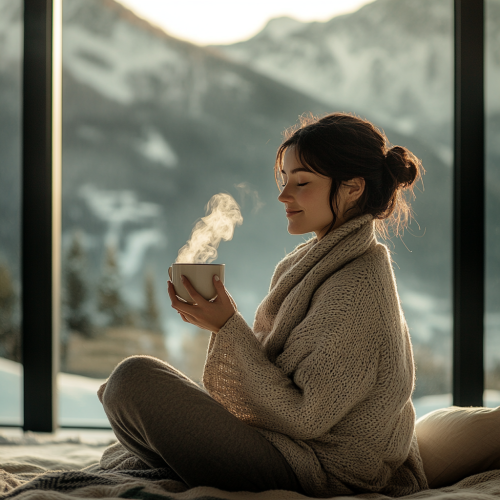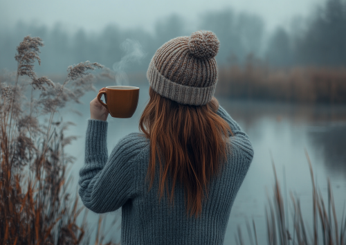 A wide cozy winter scene of a woman from behind, wearing a warm woolen beanie and a thick sweater. She is holding a hot cup of tea with both hands close to her face, creating a serene and joyful winter atmosphere. The background includes more of the surrounding chilly yet pleasant setting, with soft lighting, evoking warmth and happiness despite the cold weather. --ar 7:5