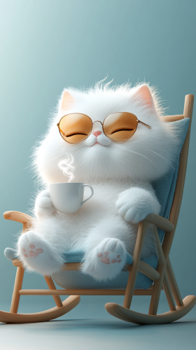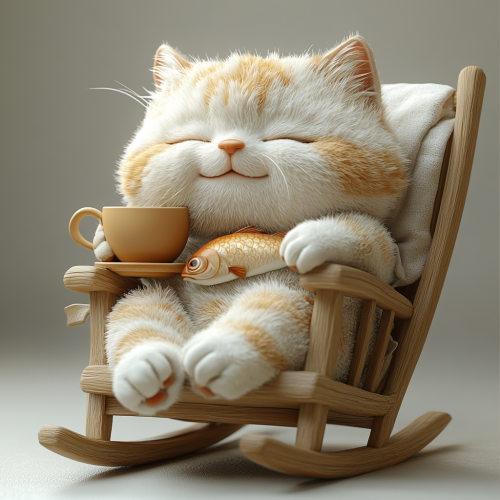 3d, cute chubby furry cat, satisfied expression, one eye open, other closed, lying in rocking chair, drinking hot tea, thinking about delicious fish, smooth white gradient background, cartoon style, minimalism, Canon camera, studio lighting --s 750