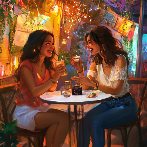 Setting: The scene transitions to a vibrant café filled with colorful decor and fairy lights. Friends are seated at various tables, enjoying drinks and snacks, creating a warm and lively atmosphere. Focus on Vivian: • Physical Appearance: • Vivian Chen a Chinese girl is seated at a small table with her best friend Eesha. She has changed into a bright, casual t-shirt, and her camera rests on the table, signaling her comfort in this space. Her expression is more relaxed, showing a hint of a smile as she engages in conversation. Focus on Eesha: • Physical Appearance: • Eesha, her Indian best friend, has long, dark brown hair styled in loose waves, wearing a bohemian-style blouse paired with skinny jeans. Her brown eyes sparkle with enthusiasm as she gestures animatedly, embodying her supportive and vibrant personality. Actions: • The two friends lean in toward each other, laughing and sharing snacks. Eesha is animatedly encouraging Vivian, her hands emphasizing her words as Vivian listens intently, her expression softening.