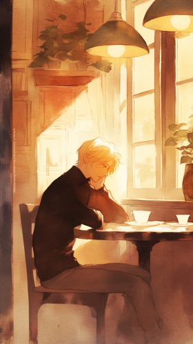 A picture using a watercolor style. Light color. A man with short blonde hair, wearing a black sweater, sitting alone in a small café by the window, staring at the empty chair across from him, lost in deep thought. --ar 9:16 --niji 6
