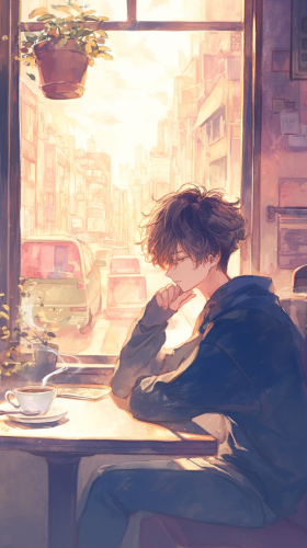 A picture using a more structured and bold watercolor style. A young man with short dark hair, sitting alone in a café by the window, lost in thought. The background is filled with soft, pastel tones, showing the busy street outside, while he stirs a cup of coffee absentmindedly. --ar 9:16 --niji 6