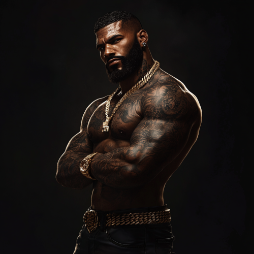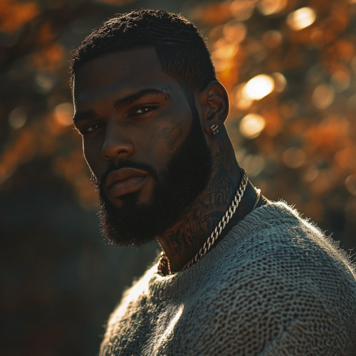 athletic build BLACK MAN standing against a wall with RICH DARK SKIN. He has DETAILED tattoos on his neck ONLY, wearing a tan sweater with a gold Cuban chain. He has a beard and close-cut, silky hair. His edge up is sharp and perfect! Street guy, mafia vibe.
