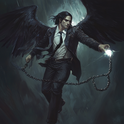 man in leather jacket, white shirt and tie, kakhi pants, dark hair. He's holding a chain with a large silver ball on the end that glows white. Huge black raven wings extend from his back.