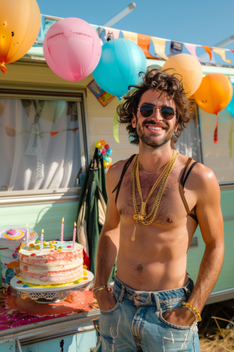 Yang man wears tank top and gold chain in front of a old caravan with kids birthday decoration, birthday cake, Birthday Decoration, full body, summer, --ar 2:3 --v 6.0