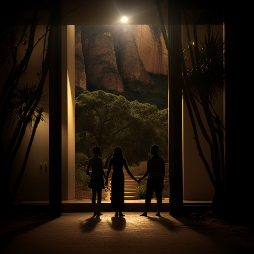 Niu, Mofreus e Triniti em Zion, diálogo sobre vida pós-Matrix 4, Mofreus falando de vigilância, Triniti concordando com um sorriso, cena noturna em Zion, iluminação dramática e contrastes fortes, Fotografia, estilo moderno contemporâneo, câmera DSLR, lente teleobjetiva, fotorealismo, --ar 1:1 --v 5.2