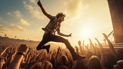Photo of a rockstar jumping to the crowd in a concert. Dany Clinch style --ar 16:9 --v 5.2
