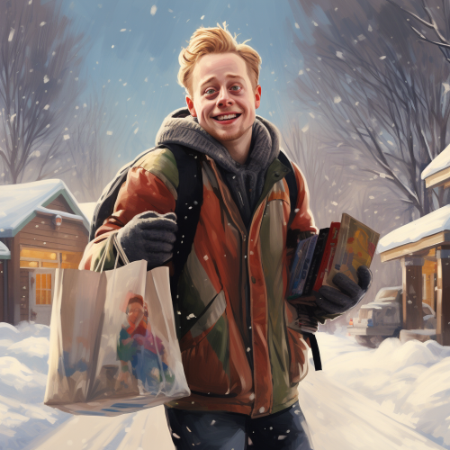 macaulay culkin from home alone, pixar style animation, carrying grocery bags, snow background