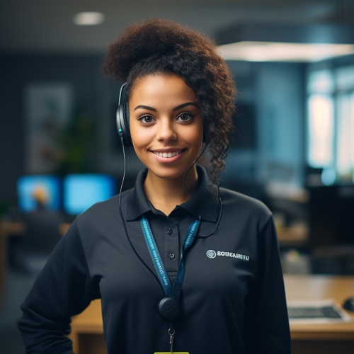 Customer service rep with 'HomeLock Protected' badge and high-tech headset in a clean office. Portray trust, safety, and reliability. Wanted: UHD portrait photography in raw style, trending on ArtStation, with high contrast, harsh light, and bokeh. ar 4:3.