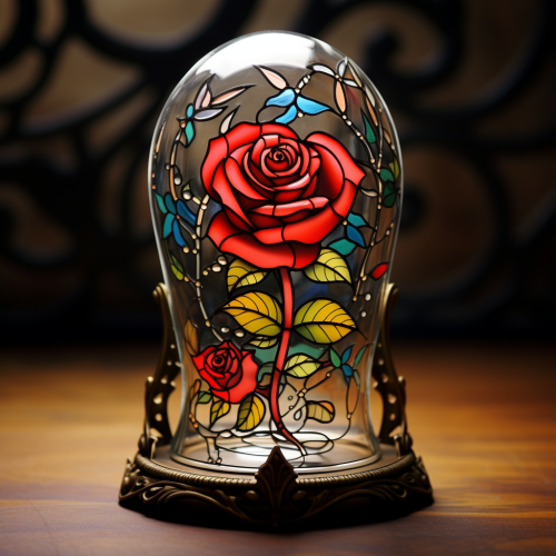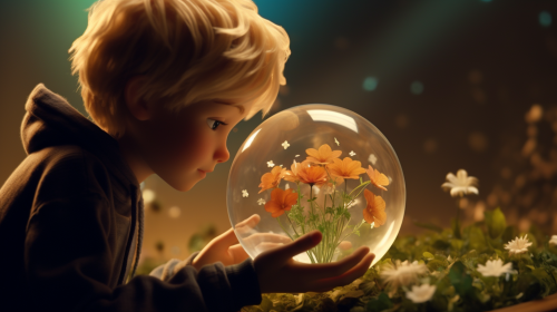 The Little Prince gently placing a protective glass dome over his flower. The flower looks happy, with a small smile, but the prince has a slightly sad expression. Pixar style animation, vibrant colors, emotional scene --ar 16:9 --v 5.2 --style raw