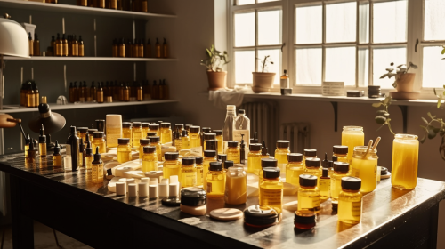 high-fashion photograph of a skincare lab. the walls are sunny yellow and the table is black. the lighting is vibrant and bright. there are glass jars with white creams inside them on top of the table. and small petri dishes with dallops of skincare ingredients in them. --ar 16:9 --v 5.0 --s 750