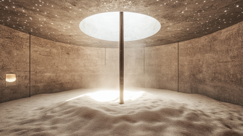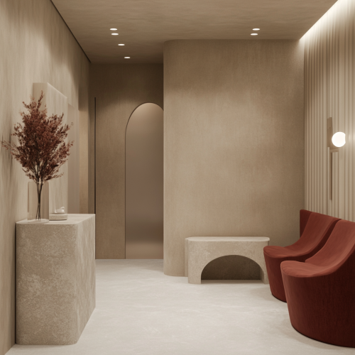 interior concept crafted for clinic, beige grey colour of walls, I want to use glass stone textures and a bit red textile, can you inspired by style of Harry Nuriev and Kelly Weastler
