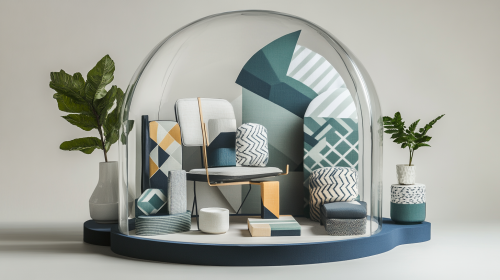 A glass dome containing various elements of the brand, such as products and logo designs textile designs, with an overall color scheme in shades of navy, gray, green, and white. The composition includes geometric shapes, a chair made of Japanese-kumiko, plants like a Bonsai, books, vases, art pieces on display, all arranged inside the transparent sphere, Japanese style. --ar 16:9 --v 6.1