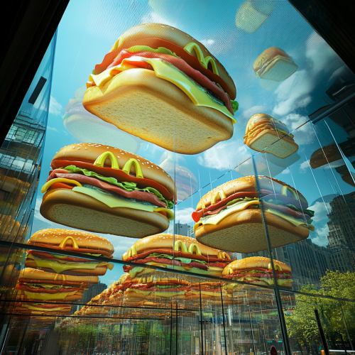 MCdonald's store located in the middle of the square. On the roof only arranged many huge 3D McDonald's sandwiches and the whole thing is surrounded by a glass window. Photo taken from below at human height.