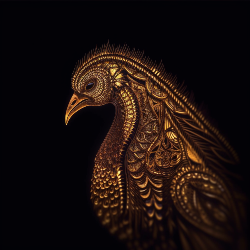 Square sticker of a very ornately cut extremely shimmering GOLD AND very bright shining bronze Cut Paper of a big fat Turkey, isolated against a deep black background, centered composition, extremely dramatic studio lighting, extreme and very crisp detail, 16K, photorealistic, dream --chaos 45 --stylize 995 --weird 65 --v 5.0