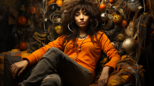 stunning photograph of 20-year-old female model lounging, full body wide angle shot, long hair, late 2010s, chaotic surreal background, dof, chaos personified, realistic, highly detailed, charcoal orange and yellow color scheme --ar 16:9 --s 750