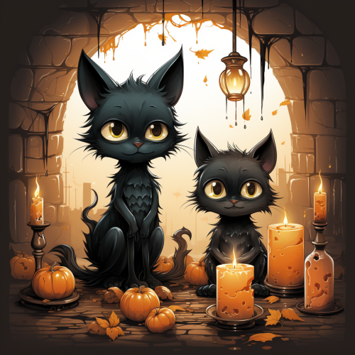funny halloween pic with two cats, black cat and white and black cat, cartoon style --s 750