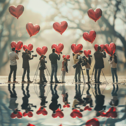 "Photographers and photojournalists, both men and women, with cameras shaped like hearts, standing in various creative poses. The scene is filled with dynamic lighting, soft natural sunlight, and reflections, showing the deep connection between their hearts and photography. Playful yet meaningful, this image celebrates the love for photography in a whimsical, artistic style." --v 6.0
