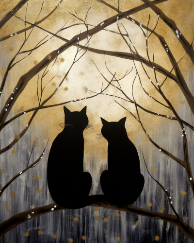 Catherine Hyde illustration of two cats in a tree tails touching watching the moon --s 50 --ar 4:5