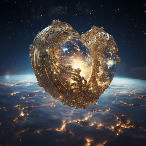Two cats staring at heart-shaped moon in space.