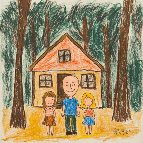 Create a simple, child-like drawing that looks like it was painted by a 7-year-old girl using oil pastels. The scene shows a friendly grandfather with a slightly bald head, standing outside his cozy little house in the forest. He has a warm smile, and his three grandchildren are nearby. The boy, with light blond hair, stands beside his two sisters – one with dark blond hair and the other with light blond hair. The colors are soft and bright, with simple shapes, and the trees and house are drawn in a basic, playful style. The overall feel is innocent and cheerful, with minimal details, focusing on a warm, loving family moment