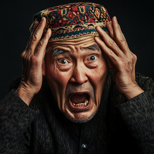 Disney Pixar movie poster, full length, elderly Kazakh, good-natured, Kazakh grandfather: on a white background in the studio, with a cane, in a coat and hat, wearing glasses, high-contrast lighting, bright and cheerful atmosphere, --ar 16:9 --v 6.1