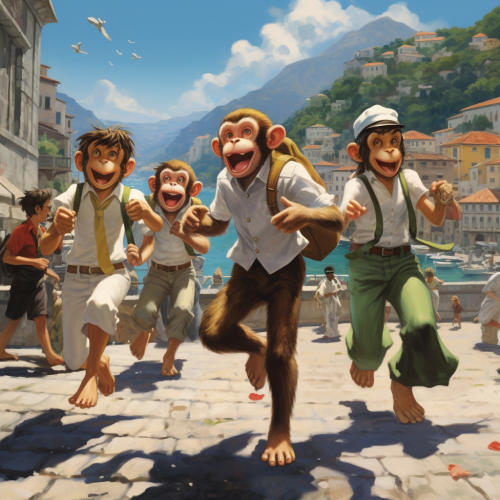 five people find a dancing mokey at Gibraltar. three boys two girls. anime style.