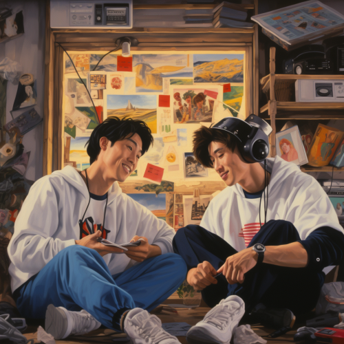 Movie still, documentary photography, editorial, in the style of Martin Parr off-centered shot of Two young women sitting side by side in a dimly lit room, sharing a single headphone while intently looking at a phone held between them, listening to a horror podcast. Their expressions are filled with fear, eyes wide as they absorb the chilling audio. The room is shrouded in shadows, with soft light casting eerie shapes on the walls. The atmosphere is tense and suspenseful, enhanced by subtle details like flickering candles or ghostly shadows. High level of detail, dramatic lighting, and an overall sense of dread. High level of detail, dramatic lighting, and an overall sense of dread. Cinematic light, 35mm, intricate details --ar 16:9