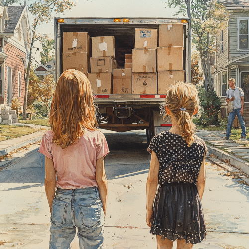 back view of two young girls standing outside. on the road in front of them is a large moving truck driving parked on the side of the road, the back of the truck is open and there is a ramp going from the road into the back of the truck. there are two men carrying boxes to it. they are in a neighborhood, houses all around. its a sunny day, bright highly saturated colors. on the left is a young girl, age 12, red hair, fair skin, wearing a pink shirt, jeans, and white sneakers. on the right is a young girl, age 10, short blonde curly hair, wearing a polka dot shirt, black skirt, and sandals. water color color pencil style illustration --q 2 --s 750 --v 6.1