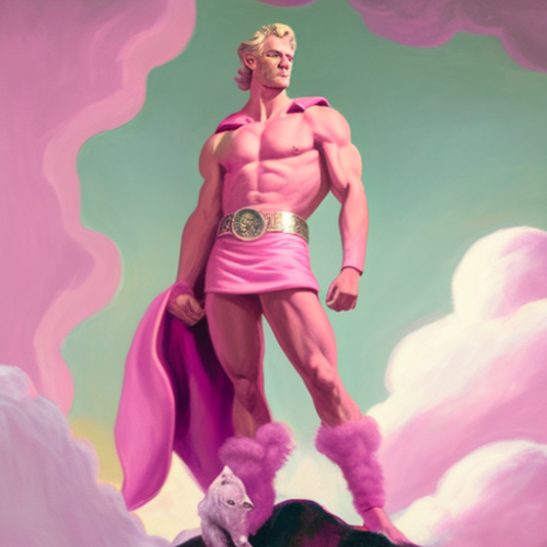 god thor in pink leather , full lenght, full body, as a surreal fantasy landscape where everything is wonderful and beautiful , fantasy, weirdcore, naturecore, painted by john currin --v 4 --s 750