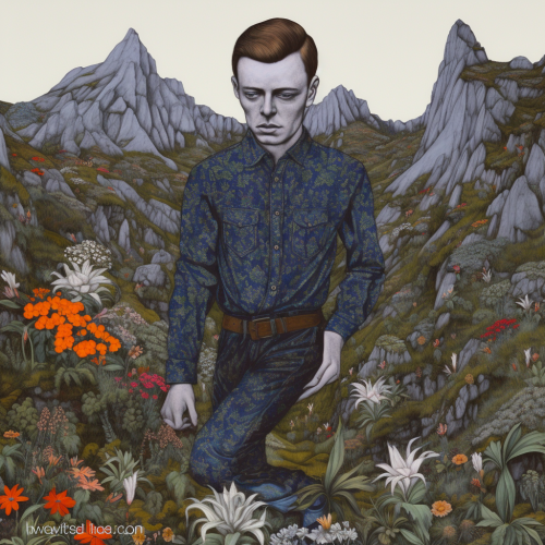 two beautiful englishlads as a surreal fantasy landscape where everything is wonderful and beautiful , fantasy, weirdcore, naturecore, flowercore, eagon Schiele --no buildings houses --stylize 750 --v 5.0