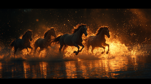 Making variations for image #2 with prompt Horses galloping over a water surface, everything dark, A dark scene, giving a dreamy and ethereal effect. You see horses from the side, galloping, with the horses well illuminated. As they gallop, they leave a trail of fire behind them. The shot should be very beautiful, like for a perfume commercial, with that kind of fancy style. It should be an interesting shot, with objects and drama, and the horses should look imposing, like gaucho style. An incredible artistic shot. Super top and fancy, highly detailed --ar 16:9