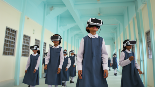 high angle of standing malaysian kids with vr in classroom --ar 16:9